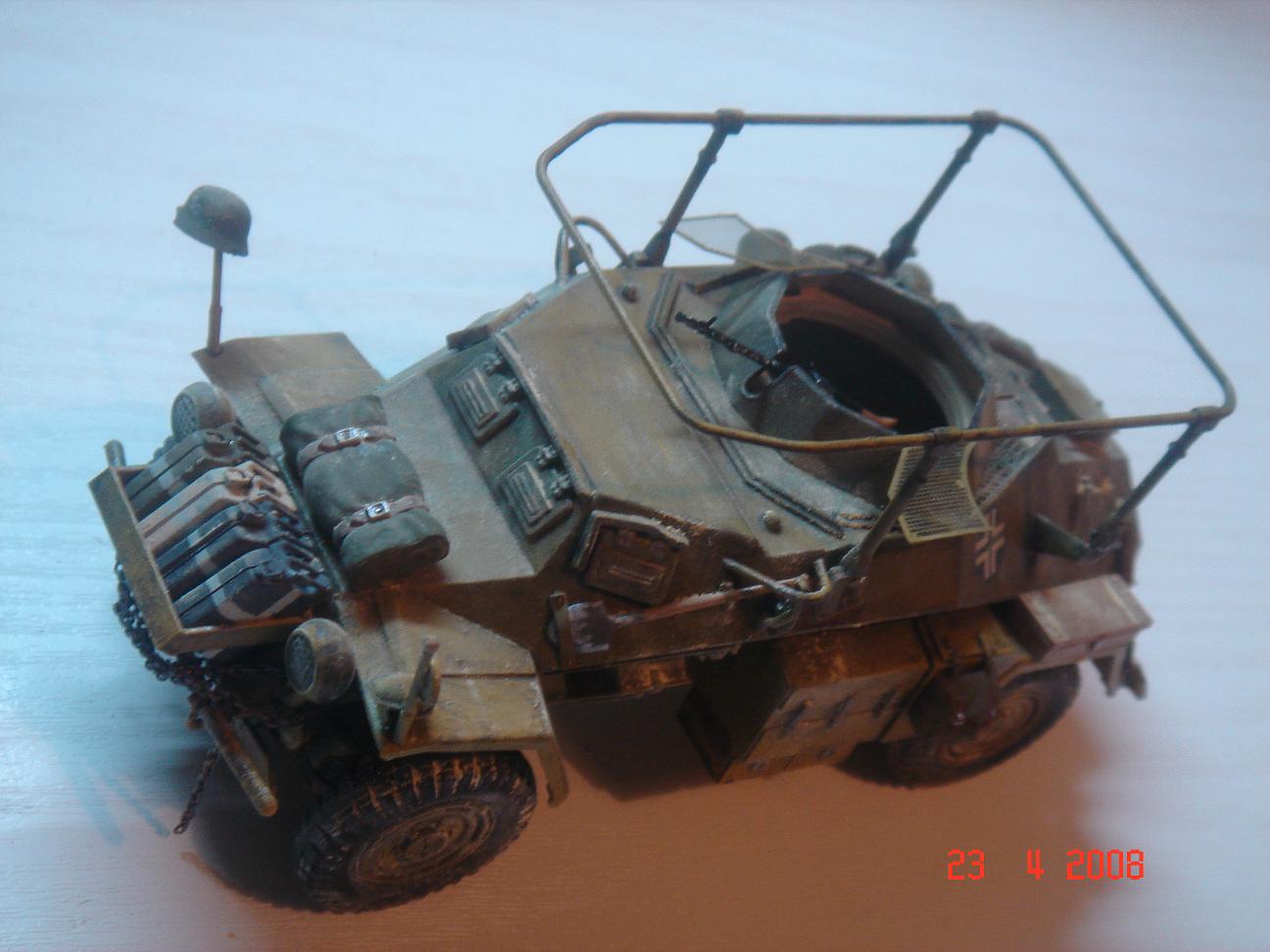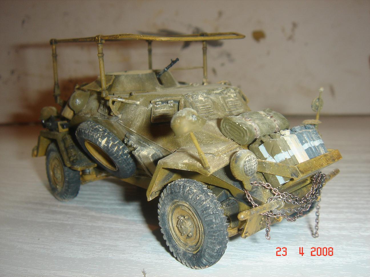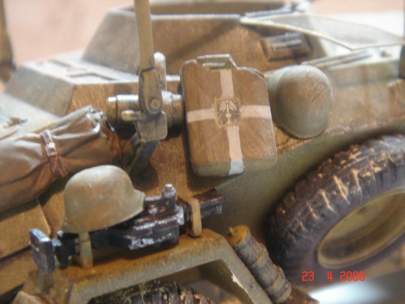 Что могу сказать по представленной модели. Достаточно добротная изкоробочная сборка, но есть места, где заметен незачищенный стык от пресс-форм. Пластиковые брезентовые скатки надо или сильно дорабатывать, или все-таки делать самому из, допустим, туалетной или оберточной бумаги, опять же тогда и ремни на них можно сделать нормально. Зачем повсюду каски (особенно там, где до них из БО не дотянешься)? Их действительно частенько вывешивали наружу, но уж не на габаритные "усы"... Покраска - так и не понял - кистью красилось? Поверхность имеет явно выраженную факутуру - или следы от кисти, или это так потом неровно спрей из баллончика лег, зернами. Из баллончика, ИМХО, заборы красить хорошо, для всего остального у него распыл слишком неконтролируем. Пигментом действительно местами "присыпано", чуть ли не изображая горку песка. В общем, получилось как-то... не то, чтобы неаккуратно, скорее неакцентировано. То есть цельного впечатления окраска не создает.