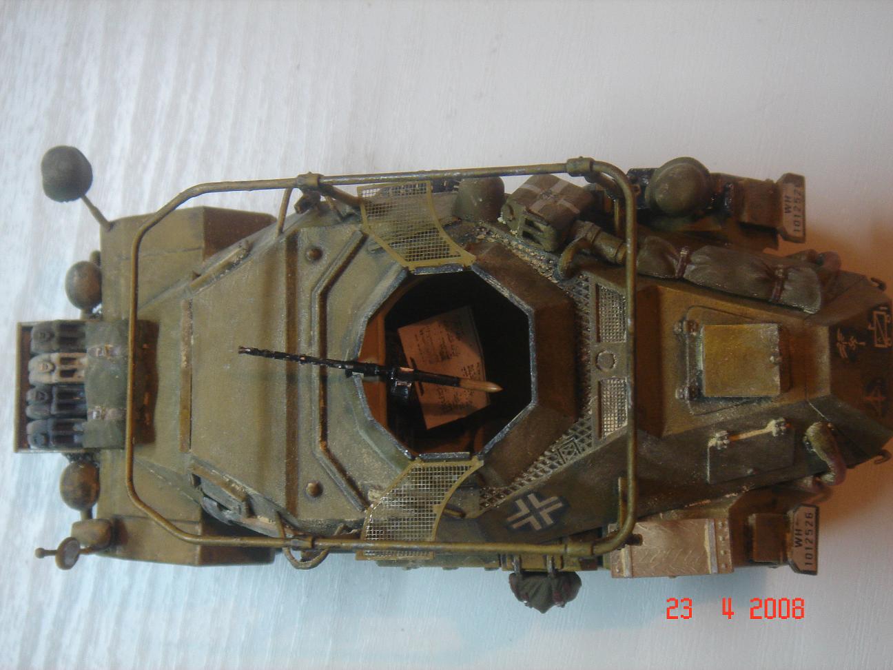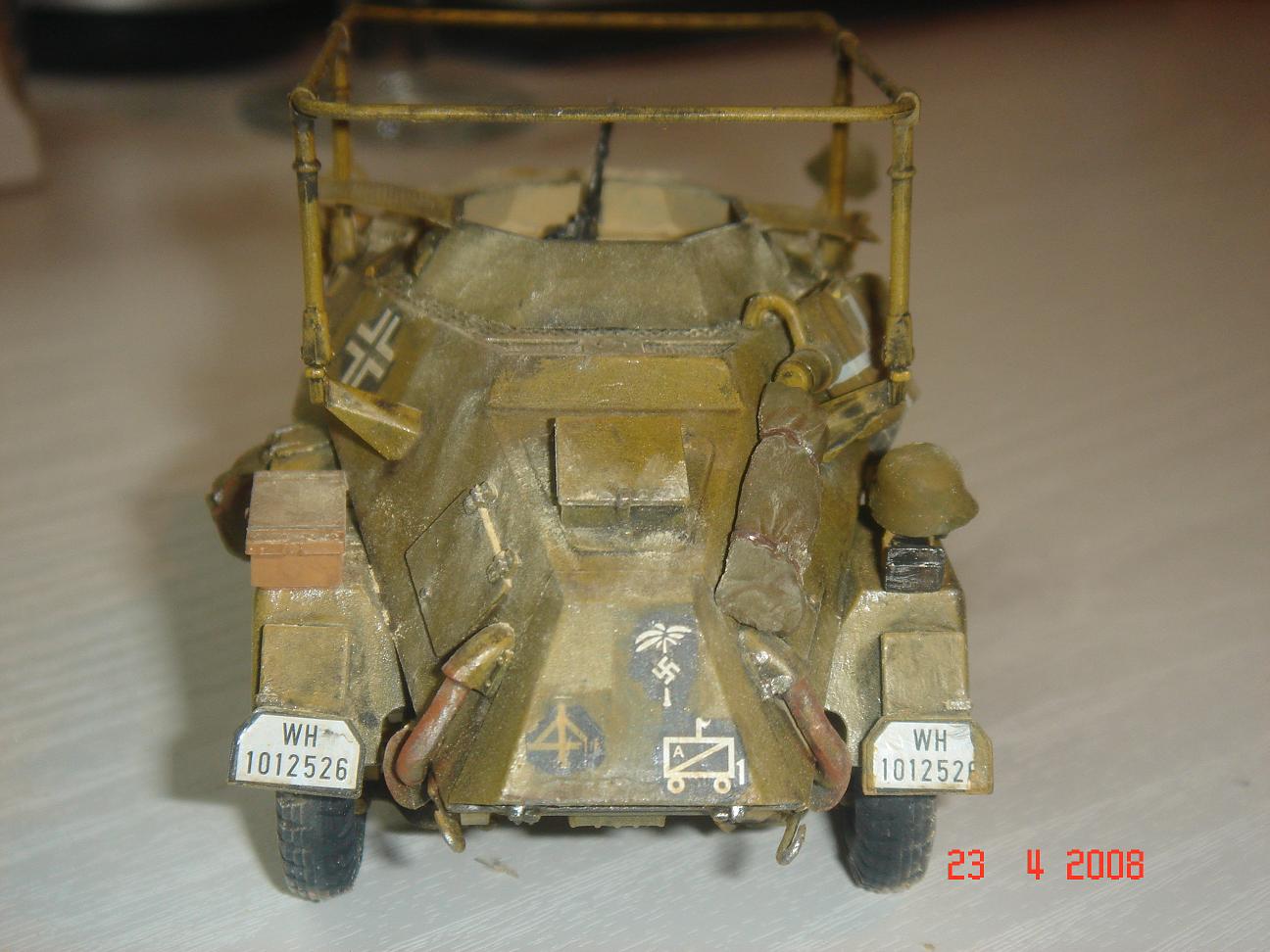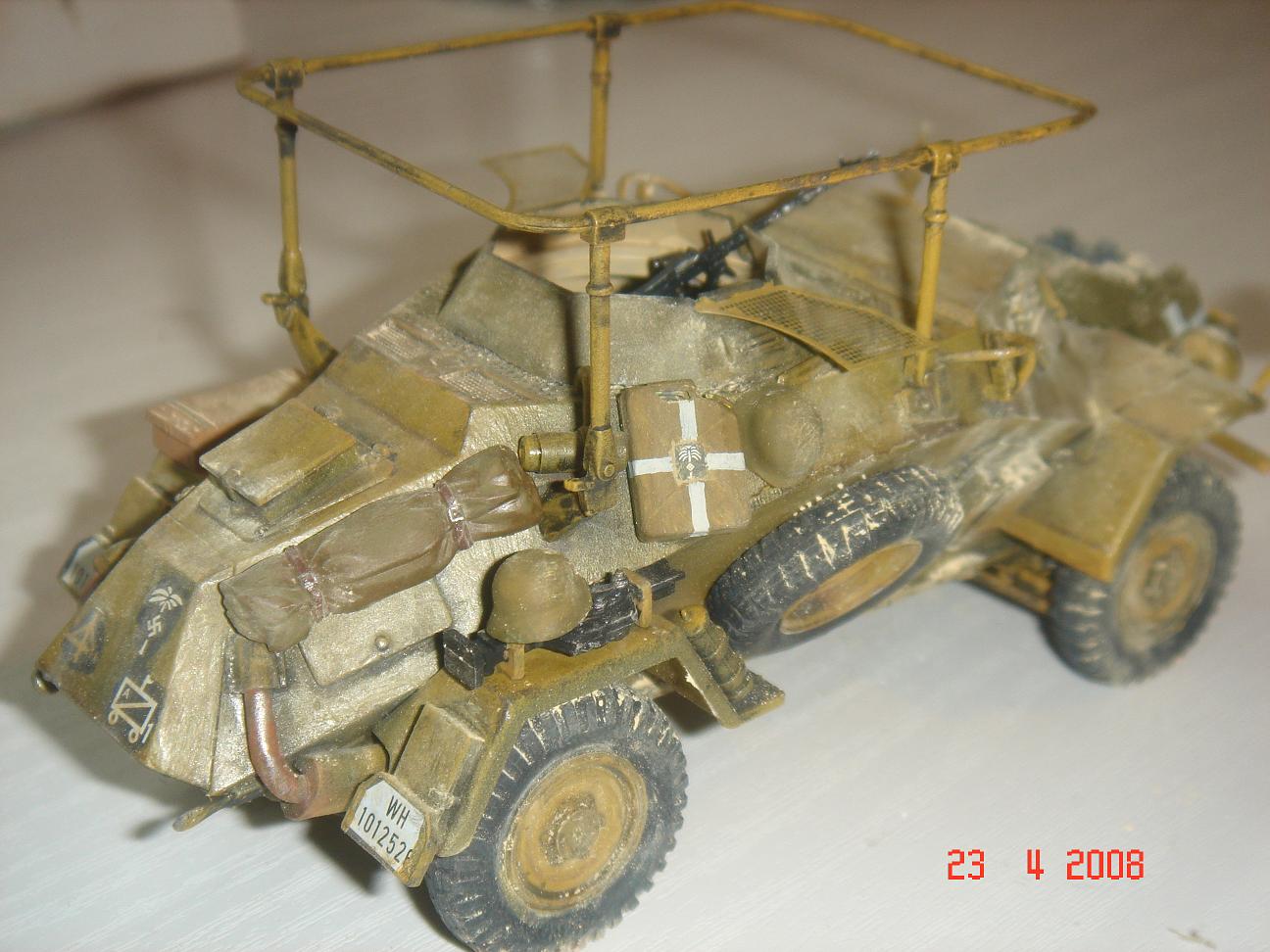Что могу сказать по представленной модели. Достаточно добротная изкоробочная сборка, но есть места, где заметен незачищенный стык от пресс-форм. Пластиковые брезентовые скатки надо или сильно дорабатывать, или все-таки делать самому из, допустим, туалетной или оберточной бумаги, опять же тогда и ремни на них можно сделать нормально. Зачем повсюду каски (особенно там, где до них из БО не дотянешься)? Их действительно частенько вывешивали наружу, но уж не на габаритные "усы"... Покраска - так и не понял - кистью красилось? Поверхность имеет явно выраженную факутуру - или следы от кисти, или это так потом неровно спрей из баллончика лег, зернами. Из баллончика, ИМХО, заборы красить хорошо, для всего остального у него распыл слишком неконтролируем. Пигментом действительно местами "присыпано", чуть ли не изображая горку песка. В общем, получилось как-то... не то, чтобы неаккуратно, скорее неакцентировано. То есть цельного впечатления окраска не создает.