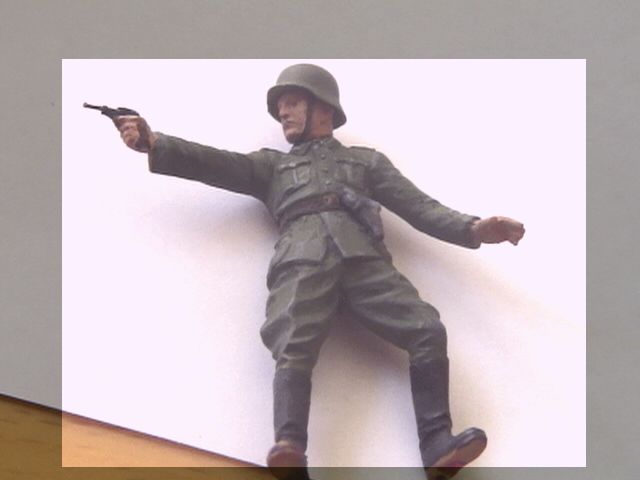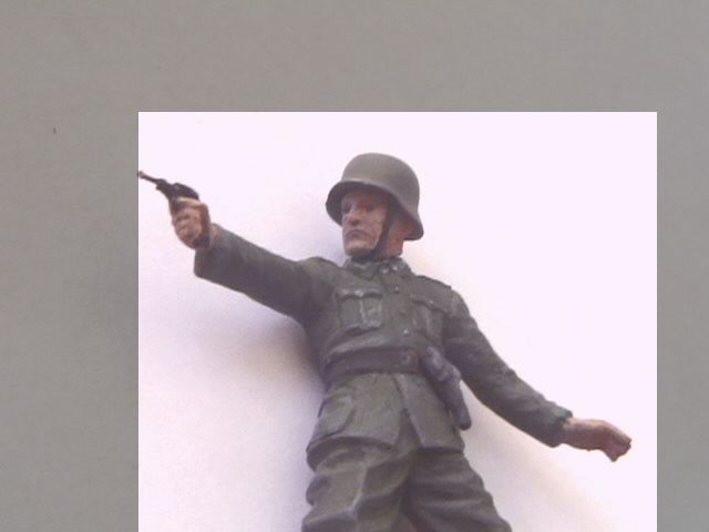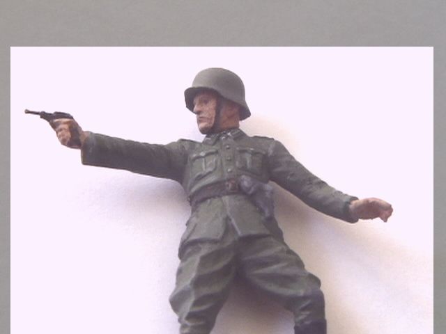 Вообще не очень аккуратно(особенно не понятна ситуация в районе рукоятки пистолета), на лице похоже что слой краски слишком толстый. Высветления драйбрашем?